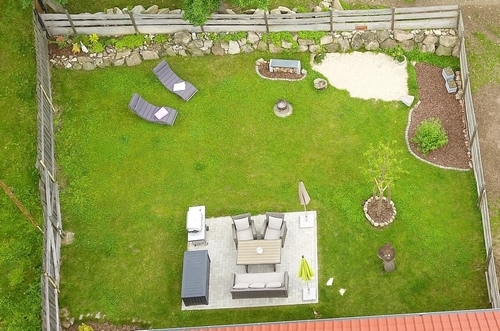 Zu dem Sitzplatz mit praktischem Gasgrill und den gemütlichen Sonnenliegen gesellen sich nun eine romantische Feuerstelle und ein großer Sandkasten.
